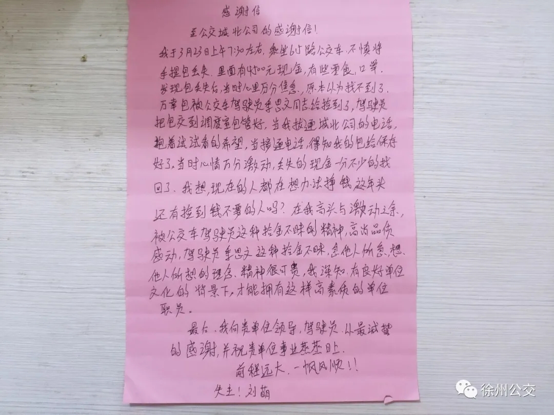 前幾日,市民劉女士在二十四中乘坐615路6952車前往城建家園,上車后,劉女士將隨身攜帶的手提包放在了座位上,下車時有些匆忙,將手提包遺忘在了車上。駕駛員季恩文到食品城公交首末站打掃衛(wèi)生時,發(fā)現(xiàn)了劉女士丟失的手提包。由于已經(jīng)到了發(fā)車時間,季師傅將包收好,到達劉灣調(diào)度室后交給了工作人員。經(jīng)檢查,包里有4500元現(xiàn)金、駕駛證、身份證等重要物品,此時,發(fā)現(xiàn)手提包丟失了的劉女士也撥打了服務(wù)熱線,得知她的物品已被妥善保管后,劉女士十分激動。當天下午,劉女士拿回失物并特意寫了一封感謝信表達對季師傅的感激之情。