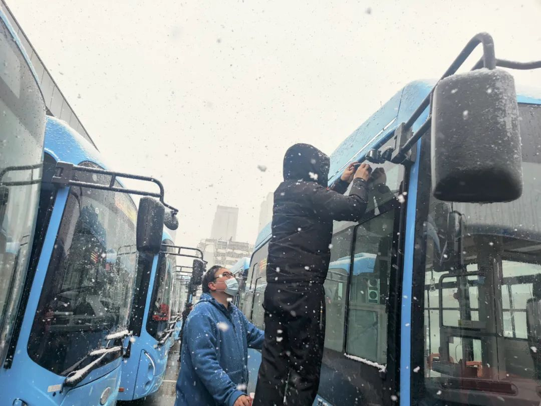 1月14日上午,徐州市氣象臺發(fā)布道路結(jié)冰黃色預(yù)警[Ⅲ級/較重],氣溫驟降,徐州迎來了2023年第一場冬雪。面對寒潮雨雪冰凍惡劣天氣,公交集團立即啟動特殊天氣應(yīng)急預(yù)案,集團黨委委員、副總經(jīng)理丁玉華帶領(lǐng)安全環(huán)保部人員上線檢查,基層單位分管安全負責(zé)人以雪為令,多措并舉做好寒潮雨雪大風(fēng)天氣公交安全運營工作,保障市民安全便捷出行。