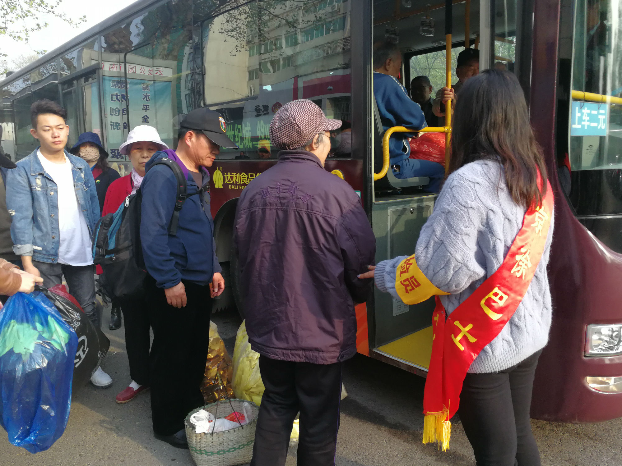 云龍公園南門,站滿了拿著大包小包的乘客?!按蠹遗藕藐牐⒁獍踩?,不要擁擠,需要換零錢的乘客可以到零幣兌換處換取零錢?!敝驹刚呶⑿χS持現(xiàn)場秩序。人群中有位提著兩個大包裹的大媽,志愿者走到大媽跟前,關(guān)切地詢問:“大媽,我來幫您把包裹拿上車吧?!敝驹刚咭皇?jǐn)v扶老人上車,一手拿著物品,為其安排好座位并叮囑大媽注意安全。一班車走后,還沒撈著喝口水,現(xiàn)場又聚滿了乘客,志愿者們又開始忙碌起來:“大爺,車還要一會才能來,您先坐這歇一會吧。”志愿者拿來板凳,讓老大爺坐下休息,老大爺十感動,說道:“你們真貼心。